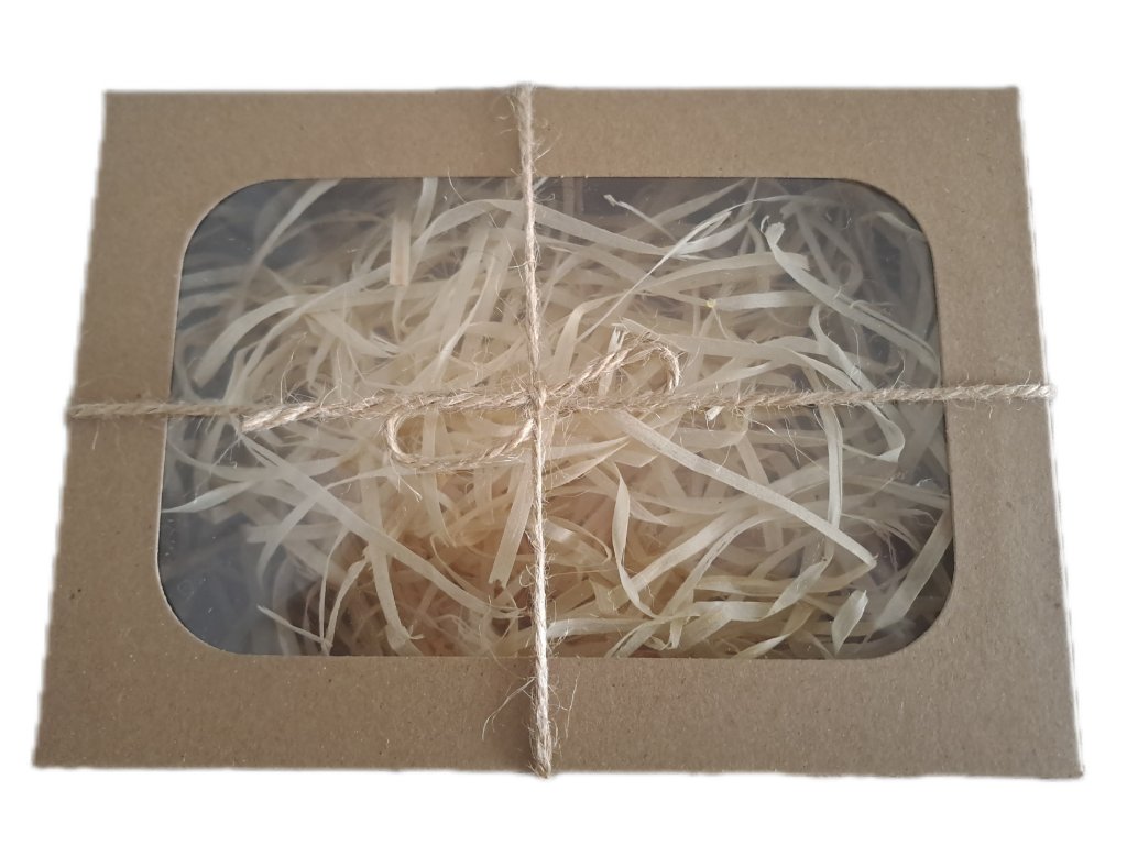Prázdne darčekové balenie s výplňou z drevenej vlny, ideálne na zostavenie vlastného darčeka z včelích produktov.